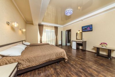 Во всех номера с 1 по 3 этаж: большая площадь, сейф, холодильник, кондиционер, телевизор, фен, балкон, своя душевая комната, комплекты полотенец, халаты, тапочки, банные принадлежности. Цена номера с завтраком.