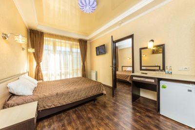 Оснащение номера: сплит-система, мини-холодильник, плазменный ТV, балкон с мебелью, фен, Wi-Fi, двуспальная кровать в DBL с ортопедическим матрасом + односпальная кровать + 1 евро-диван, 2 тумбочки, 2 прикроватных лампы, рабочий стол, ТV (телевизор с плоским экраном), душевая кабина, фен, коврик, полотенца, ванные принадлежности