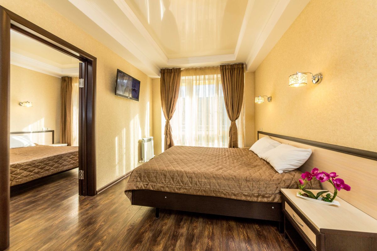 Оснащение номера: 2 сплит-системы, мини-холодильник, 2 плазменных ТV, 2 балкона с мебелью, фен, Wi-Fi, 2 двуспальные кровати с ортопедическими матрасами, 4 тумбочки, 4 прикроватных лампы, рабочий стол, ТV (телевизор с плоским экраном), душевая кабина, фен, коврик, полотенца, ванные принадлежности, халат и тапочки.